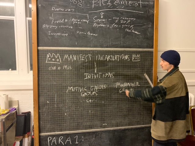 All takes place in a dream flashback to an impromptu party (mystery ‘motive’) in ‘field k’. There was beef between 2 people : ‘Serre’ (a woman) vs ‘algebraic pro-group’.