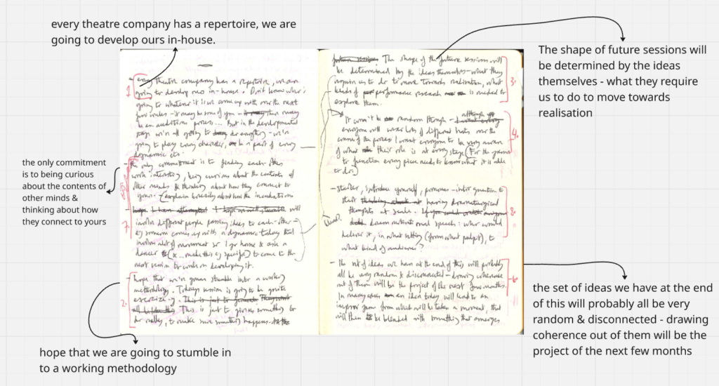 ‘The residency was designed to have 2 halves: a programme of performances, artist takeovers and interviews set along with a set of collaborative workshops. The idea was that the takeovers would attract audiences who could then be asked to join the workshop process – a ‘funnel’ of sorts. I was so optimistic about this that I had scheduled for three working groups to each be doing weekly Incubations which would lead to the development of 3 original plays over the course of the 2 month Residency period, parts of which would each be performed on the stage in the incredible Performance Space at Rogue Studios at a PW Showcase. It didn’t happen like this at all.’
