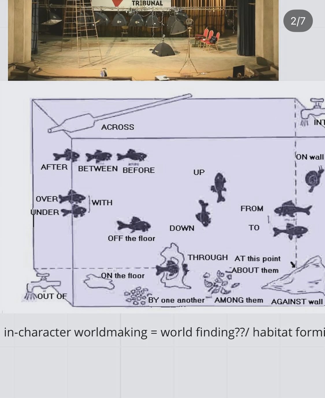 To take a set of operations that has been designed to sensibly transform one thing (a story) into another (a performance) and then apply it haphazardly to things (dead texts, un-narratives, jargon zones, legalese, formatted information, data read-outs etc) that it doesn’t work for and see what half-baked botch-job performances come out the other end.